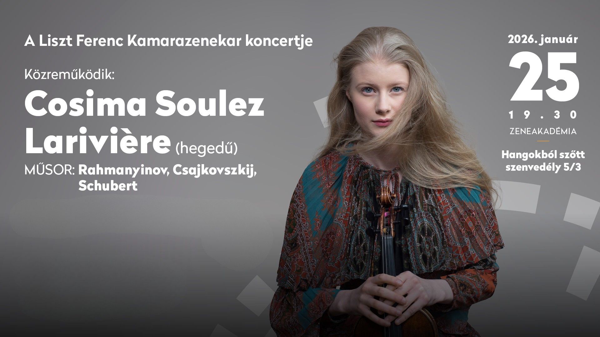 Próbatermünkbe érkezik Cosima Soulez Larivière francia–holland hegedűművész, akivel a következő napokban készülünk telt házas koncertjeinkre: január 25-én a Zeneakadémián, január 26-án Székesfehérváron lépünk fel.